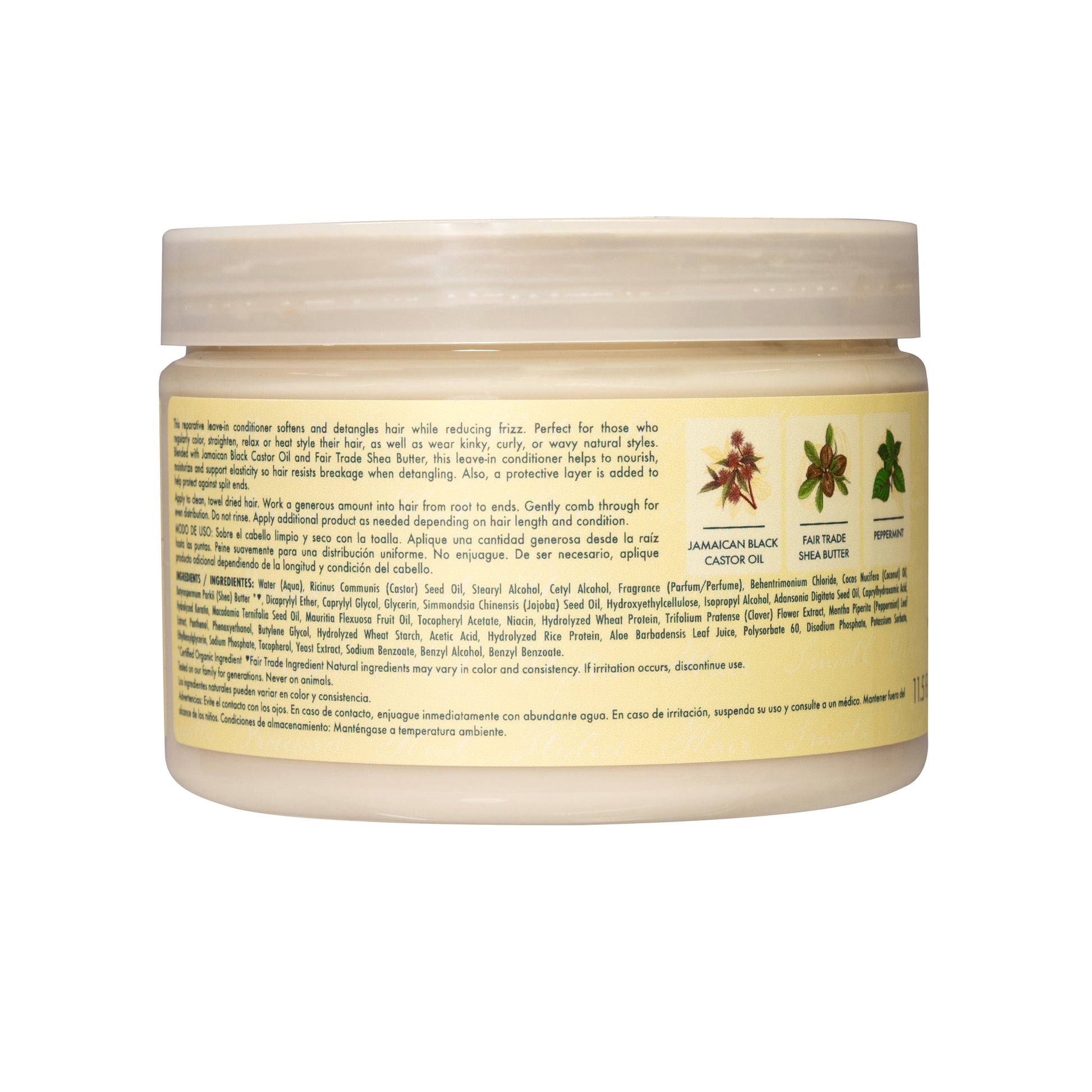 This reparative leave-in conditioner softens and detangles hair while controlling frizz. Perfect for those who regularly colour, straighten, perm or heat style their hair, as well as kinky, curly or wavy natural styles. Formulated with Jamaican Black Castor Oil and certified organic Shea Butter to nourish, moisturise and support elasticity so hair resists breakage when detangling. Conditioners provide a protective layer that improves the appearance of split ends. Peppermint stimulates the scalp for an invigorating experience.